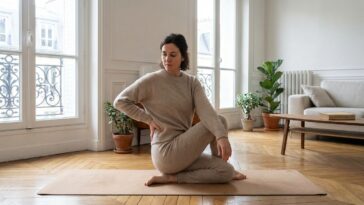 Après l’automassage, place à un étirement simple à faire partout (même sur le canapé, entre deux biberons !). Il redonne de la mobilité et allège la sensation de lourdeur.